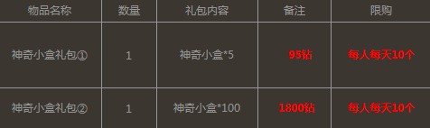 活动内容:活动期间,商城上架【神奇小盒】礼包,打开神奇小盒将随机获得以下物品中的其中一种: