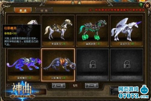 培养:需要消耗1个“兽灵石”或一定的钻石,会对当前坐骑进行一定的属性提升,更为惊喜的是,与此同时,有一定的几率出现兽神祝福,此祝福效果可将本次提升的属性增加至几倍之多。