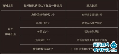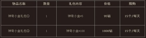 活动内容:活动期间,商城上架【神奇小盒】礼包,打开神奇小盒将随机获得以下物品中的其中一种:史诗的神奇碎片1个,灵魂水晶5个,兽灵石2个,迷宫硬币10个,神奇碎片宝箱1个!大量珍稀道具等你拿~