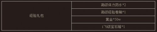 活动内容:活动期间内,玩家充值任意金额即可获得经验礼包一份。