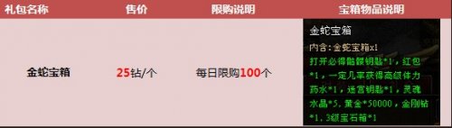活动介绍:商城上架超值金蛇宝箱,售价25钻一个,每日限购100个。