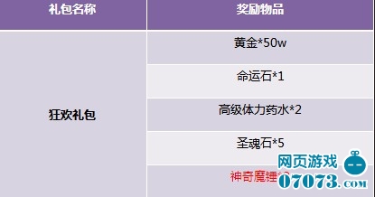 活动内容:活动期间玩家充值任意金额,即可获得超值狂欢礼包一份,狂欢礼包更有稀有神奇魔锤2个!
