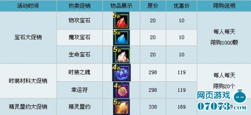 【活动内容】活动时间,商城限时热卖区,物攻宝石,魔攻宝石,生命宝石5折促销,每人每天限购1000颗。还有时装之魄、幸运符、精灵盟约跳楼大甩卖。
