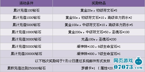 1. 活动期间单个角色累积充值达到指定条件即可以获得对应的充值奖励,累积充值额度达到最高之后不再计算累积充值奖励;