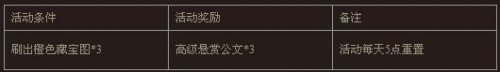 活动内容:活动期间,玩家每天刷出3张橙色藏宝图,即可获得高级悬赏公文*3,助力玩家升级冲冲冲!