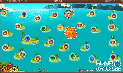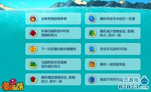 进入大富翁模式后一共有2层,每一层都有一名守关BOSS,把这货K.O后就能进入下一层了!2层的难度只比一层的提高了10级,在第一层可以应付过去的,2层也没问题。小岛上的泡泡替代了传统的一格格方块,并可以在这个模式中临时修改阵型和补充宠物体力。在地图上都会数字1~6,这是为了告诉您下几步要走到的位置,琳琅满目的各式图标都代表着一种特殊效果。有的可以帮您加强攻击力、有的可以巩固防御力、甚至还有让您的体力值补满。
