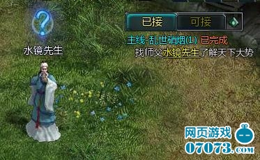 欣赏完一段宏伟华丽的开场动画后,玩家会站在新手区域——隐龙村的村庄内,身旁那个头上顶着蓝色感叹号的白胡子老头,便是玩家们的师父——水镜先生。玩家通过访问水镜先生(也可点击任务追踪中带下划线的链接)接取第一个主线任务——乱世硝烟,开始了在隐龙村的新手生活。