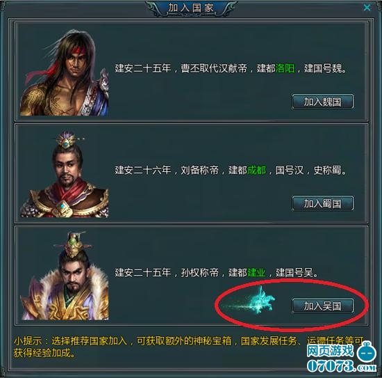 在完成新手村最后一个任务后,玩家将做出乱世人生中最重要的一个抉择,是加入实力雄厚的曹操所在的北魏帝国?还是踏入入义薄云天的刘备所在的西蜀之地?抑或是拥有大小乔的孙权所在的东吴水乡?在加入国家界面中,会有推荐国家的标志,加入了系统推荐的国家,会有额外的奖励哦!