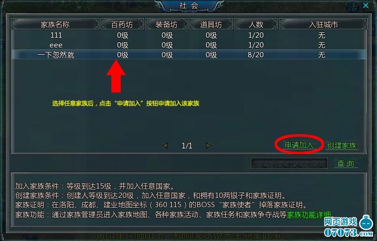 玩家等级到达15级,并加入国家。在游戏界面打开社会界面打开社会界面后,选择家族申请,每次最多可申请10个家族,申请完成以后就只需要等待该家族的官员的审核通过。