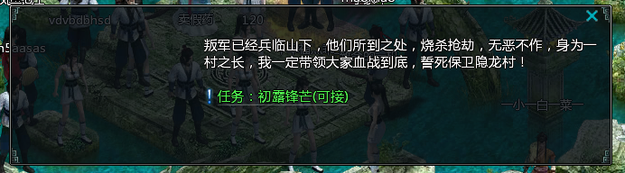 玩家到达指定地点,与npc对话后,便得到了任务信息,叛军已经兵临山下,他们所到之处,烧杀抢劫,无恶不作,身为一村之长,我一定要带领大家血战到底,誓死保卫隐龙村!战况紧急,玩家赶紧接下任务,奔赴沙场!