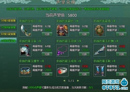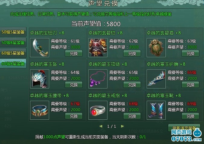 声望兑换中,玩家角色等级不同,能够兑换的星级装备和所需要的声望值也有所不同。