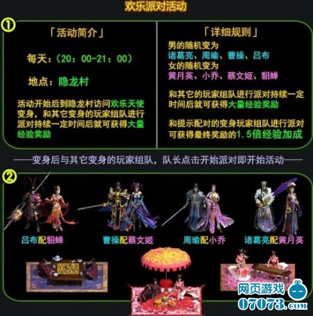 完成方式二:变身后,跟任意武将或美女二人派对,二人派对时间结束后,活动完成获得大量经验。