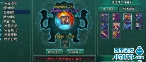 紫金强化可以从铸造界面的紫装进阶找到,(只有紫色的装备才可以强化)。装备的等级越高,可进阶的等级也就越高,60级紫装可以进阶一级、70级可进阶2级……90级可以进阶4级,每强化一级都需要同等级装备类型的紫金石来强化
