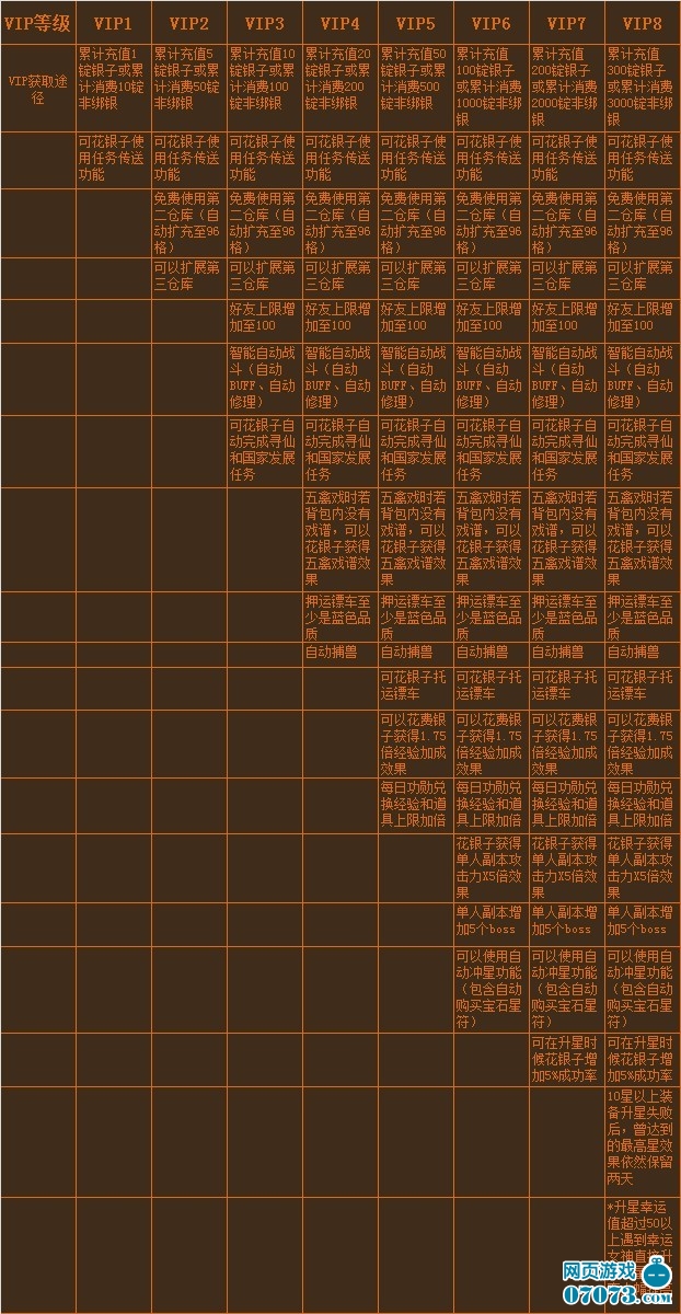VIP7级礼包:紫金碎片2个(按等级随机给) 乾坤珠5个 青铜麻布或精铁丝绸一级各10个 绑银5000两