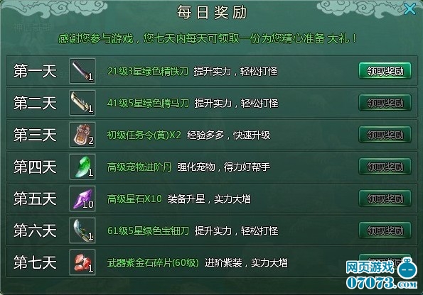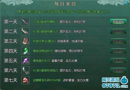 每天上线即可领取一份精美礼包,连续7天,在“便捷面板”中选择“礼包领取”