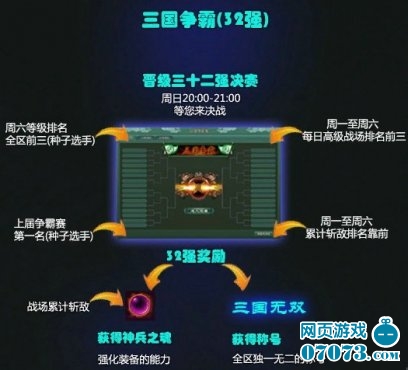 晋级32强的玩家将会获得增强装备属性的神兵之魂,并获得全区独一无二的称号。并且前三名玩家将记录在争霸史册上,名流千史。即使没有成功晋级的玩家也不用气馁,只要斩敌数达到30、120或者400个,都能获得相应的神兵之魂奖励哦。