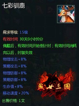 七彩驯鹿,需求等级15级,有效期三天。它代表这神话和好运。它拥有这属于自己的特色的物理攻击、策略攻击、物理防御、策略防御、生命值和移动速度。