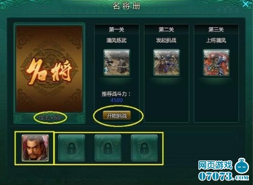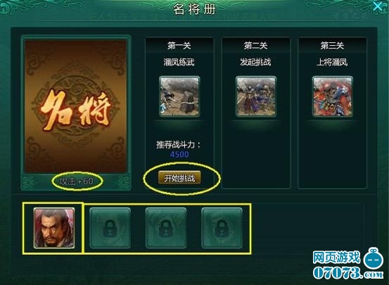 打开‘名将册’界面,选择某位英雄,点击开始挑战;