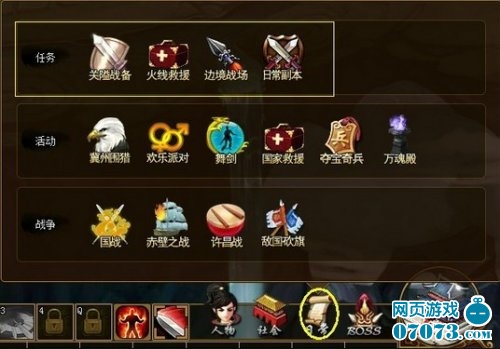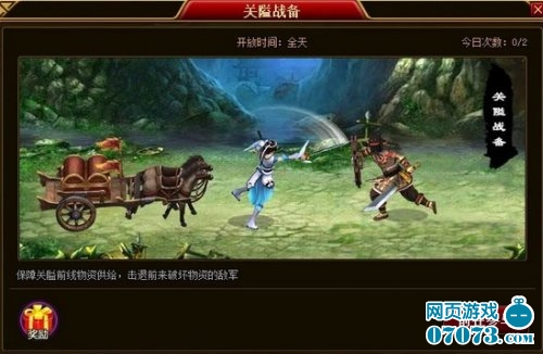 关隘战备(包含了关隘巡逻、争夺物质)关隘巡逻任务次数:每日1次首次领取任务条件:完成了“押运物资”任务任务接取时间:全天任务流程:玩家在押运官处接取任务,玩家在本国关隘击杀50个袭击镖车的山贼即可完成任务。争夺物资任务次数:每日1次首次领取任务条件:完成了“关隘巡逻”任务任务接取时间:全天任务流程:玩家在押运官处接取任务,玩家到敌国(两个都可以)抢夺10个镖车即可完成任务。