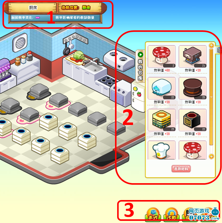 1、 玩家在更换灶台时系统将显示更换前与更换后所增加或减少的厨房效率值; 2、 玩家已拥有的厨房灶台及每种灶台的效率值; 3、 装潢功能按钮。 毛胚:撤消所有装潢 还原:将装潢变成保存时的设置; 保存:保存已改变的装潢设置; 关闭:关闭装潢界面 |