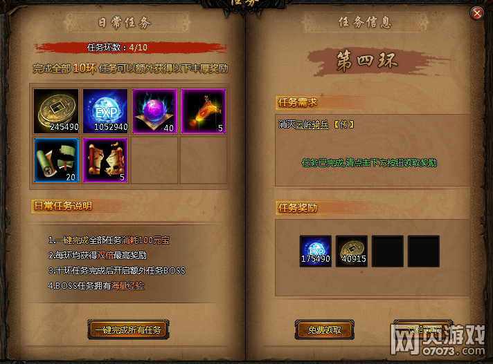 另外还有一个主要的经验来源—日常任务;日常任务每天一轮,共十个;完成十个任务后会有一个额外的BOSS任务,可以获得大量的经验材料奖励。