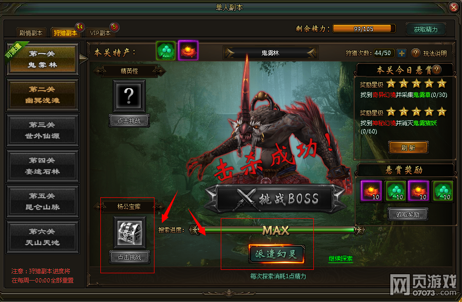 击杀守关BOSS后,挑战杨公宝库可获得大量幻灵技能书,坐骑进阶材料;挑战完成后记得派遣幻灵继续去探索获取奖励哦!