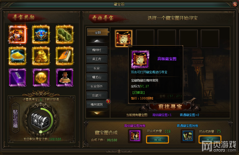 藏宝图:收集齐5张藏宝图碎片后即可在藏宝图界面合成一张藏宝图,可以挖取奖励。藏宝图又分为普通和极品两种。极品藏宝图更容易挖取好东西哦!