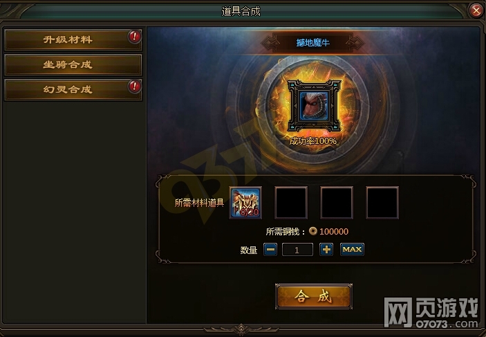 在游戏主界面下方,玩家点击“合成”图标,即可打开隋唐英雄道具合成操作面板。道具合成分为三部分,升级材料、坐骑合成和幻灵合成。
