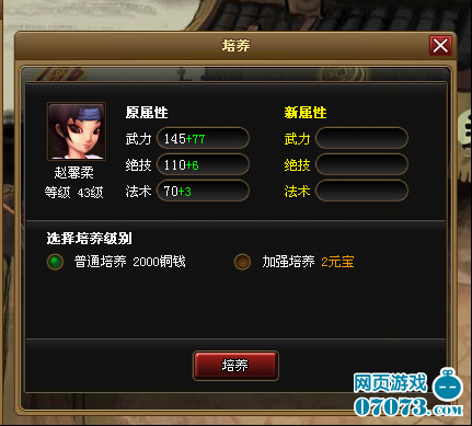 你可以用武圣阿宽和金明成,因为他们分别是格挡能力强和攻击力强,培养一下,在前期还是相当不错。RMB玩家就不用那么麻烦了,带着张麻子直接跳过吧,以后有大把的伙伴任你挑选,希望到时候你千万不要挑花了眼睛,呵呵。当然这里的培养费用是400铜钱,你可以培养好来再继续往前走。