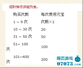 这里也会出现一个“招财神符”,等级越高,招的钱财也就越多,多一级可以多出600铜钱。当然如果600铜钱让你看不上眼的话,可以一上线就点掉。普通玩家只可以一天点一次,V1可以点3次,V2可以点5次,V3可以点7次,V4可以点9次,V5可以点30次,以后的越来越多,不过,点招财所需要的元宝也越来越多,具体可以看下图: