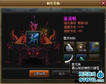 7.制作丹药或装备材料不足时,RMB玩家可以点击立即合成,则消耗元宝来弥补不足的材料。或者进入相应的副本,刷副本来满足材料的需求。当不知道材料掉落地点时,不用费力寻找,直接点击所需要的材料,系统便会自动寻路,指引你到达相应的副本。