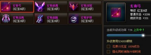 同时,充足的铜钱是强化的基础。强化不像奇术,可以用阅历来升级,而是完全靠铜钱死撑。在强化初期青铜、黑铁的级别还算便宜,上了白银就要过万铜钱了。而逍遥以上的强化更是昂贵,特别是武器和魂器。没有庞大的财力,强化没办法进行到底,所以志向高远的玩家们可要精打细算开源节流,好铁要用在刀刃上了,主攻的就优先强化武器与魂器,主防的话,就优先强化衣服了。