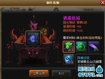 这里还要注意一点,在用制作卷制作新装备时,一定要把自己强化过的那件装备脱下来作为材料去合成,这样属性加成才会延续下去。有些心急手快的玩家在收集齐全材料后直接制作了新的,而强化了很久的装备还穿在身上,这时杯具便出现了,要穿新的装备又得重新强化,不穿吧,又不甘心。