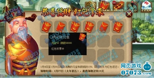 昨天上线了神仙道春节迎财神活动,活动很简单,每天铜钱与元宝消费额的10%,等过完年27号返还。
