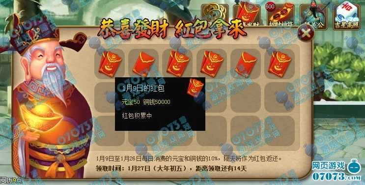 活动内容:活动期间玩家每天消费元宝和铜钱的10%,在隔天凌晨12点都会作为财神红包暂时寄存。01月27日(大年初五)迎财神,玩家可以领取并使用所有红包。
