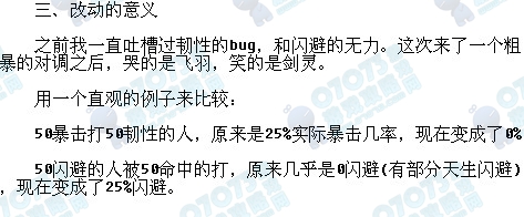 韧性的作用在低级别更变态了,而剑灵的闪避变得明显了。可以预见,即将出现四处抱怨:“飞羽说死不暴击了”“剑灵怎么闪避这么多了?”“武圣更变态了”