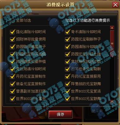 每次更新,都会有一些东西变成默认,比如“消费提示”这个非常要命的功能,一定要注意点开,不然几千元宝吃了一个丹的时候就追悔莫及了。
