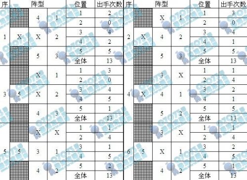 出手次数已经统一成13次了,没有多出手的阵了。不过虽说出手次数相同,不过不同的排法,不同位置攻击次数的不一样的,不过肯定会有一个位置出手5次的,一个出手4次的,所以归根到底,我们能选择的就是另外三个伙伴4次出手到底是怎么分配的?013 还是022还是112,仅此而已。目前的阵法看起来那么复杂,无非是3选一。