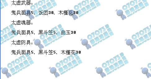 合计:黑斗笠125个,鬼兵面具150个, 曲玉150, 饭团150,木槿花750