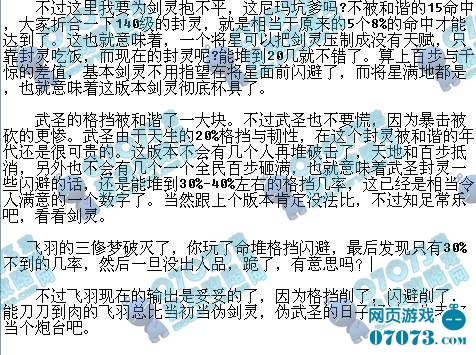 先说句找骂的话,版本和谐势在必行,原来的百分比已经逆天了,大家都开始三修了,这跟设计初衷完全两回事了。和谐之后好歹不会再出现剑灵一个人闪好几个,武圣一个人挑五个,飞羽一炮轰死一个了,三修双修遍地走,拼的全是人品了。现在的版本是职业特点再度展现的时代。唯一不被和谐的就是职业天赋,那么140级的其他职业怎么封灵闪避也超不过剑灵,怎么封灵格挡也超不过武圣,怎么封灵暴击也超不过飞羽。三大职业又回原状了。