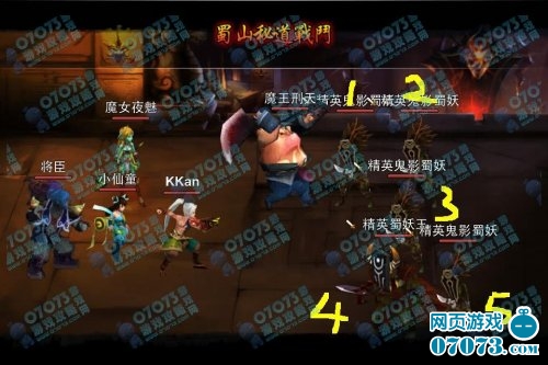 小怪:起手50气势,站位如图所示,血高防厚,法抗较低,4个绝技影袭,100%眩晕且无法格挡,使用影袭的硬性条件是普攻一次且被攻击一次,因此,1号位和3号位的小怪将在第二回合放影袭(重要);2号位和5号位的小怪将在第三回合放影袭。
