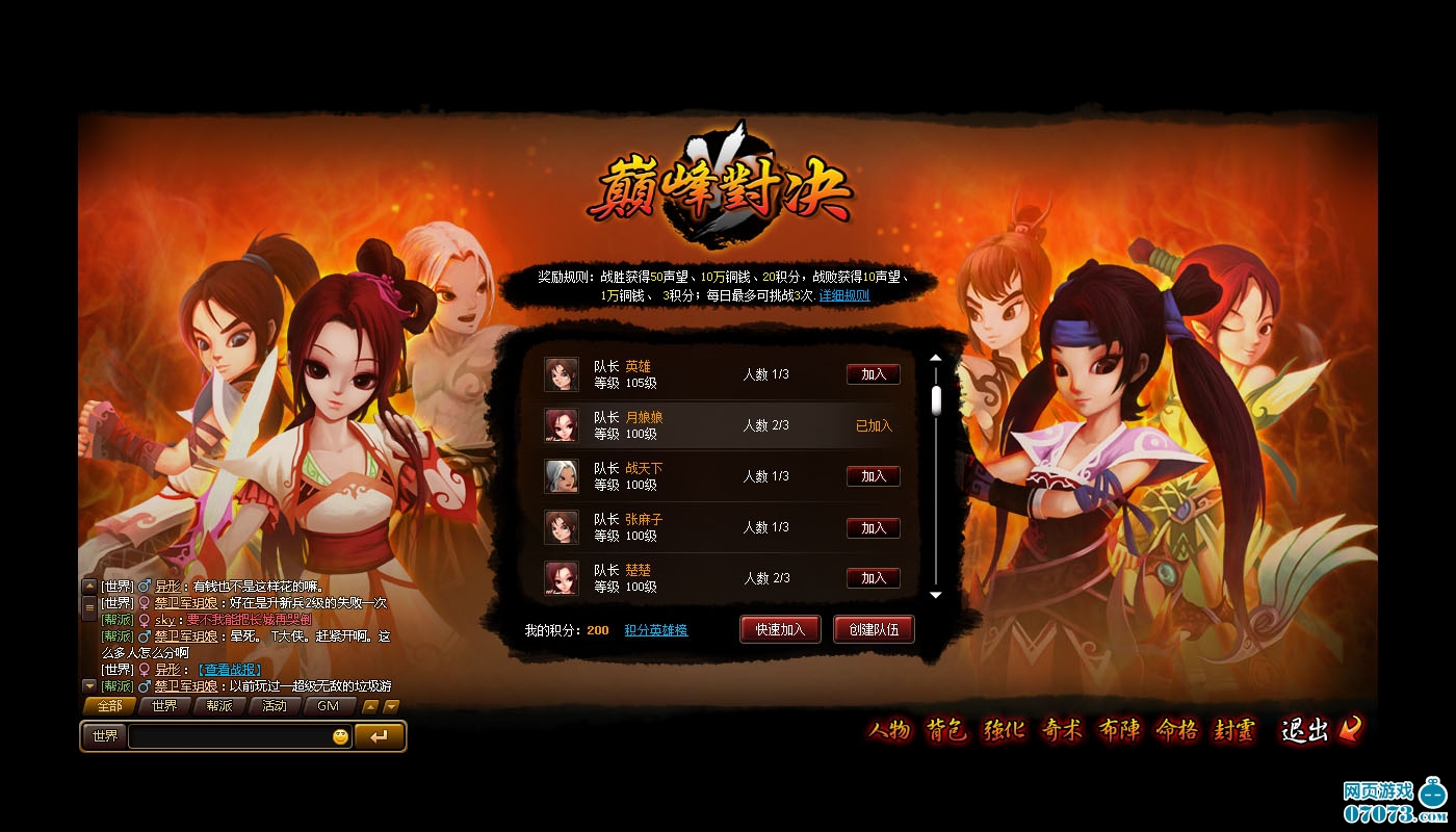 1.新系统“巅峰对决”:满足一定条件时,玩家间可组队相互进行PK,PK可获得积分,积分按照排名每周结算一次并发放相应奖励。