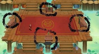 借用官方更新公告里的一张全图来说说玩法吧。台中的四个黑圈位置是采青处,采青并成功回到已方狮子处 交付得10积分,被击杀后交付得5积分,击杀对方一人得10积分,连杀有加成,被终结连杀,对方也有积分加成。战败会有鼓舞BUFF(排行榜下的“武”字处),战力提升10%,可连续叠加直到胜利一次后清零。大神们可以在对方的两个上中台的入口处。