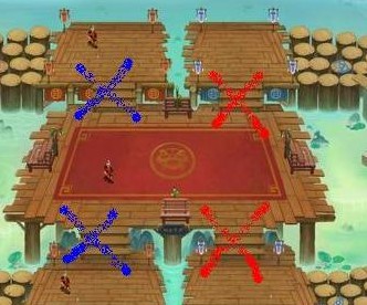 (图中打X处)不停游走击杀,战斗减员严重、血量偏低时可采青后送对方人头秒回已方阵营,交付完成等待复活CD后再满血出来继续击杀。击杀跟采青积分累加,每满100分时,已方狮头会攻击对方狮头扣血,当某方积分先达到1000分时,即取得胜利。