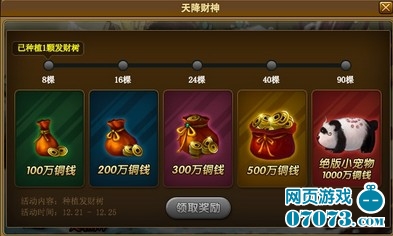 活动内容:活动期间种植的发财树数量累积到一定数量时即可额外获得铜钱奖励,最高可获得1000万铜钱奖励,并有机会获得绝版小熊猫哟!