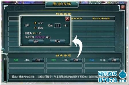 1、修炼时长每次最多为24小时。 2、需要修炼的将领不能大于主将等级。 3、使用元宝修炼将获得150%经验奖励,使用银币将获得130%经验奖励。 4、修炼中可以使用元宝来加速修炼时间。