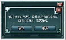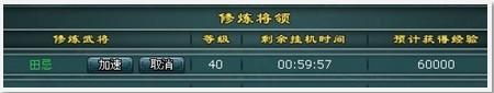 确认后,即可开始该武将的修炼,列表会提示挂机时间和预计获得的经验。 如果选择修炼“已出战”的将领,在确认游戏中的提示后,将会从当前的阵型中撤下。 修炼期间不参与战斗。