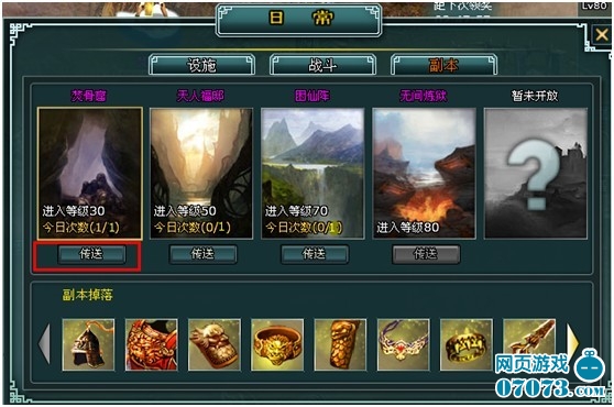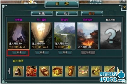 即可查看到现在可以进行的副本种类。点击焚骨窟副本传送。系统会自动寻路到焚骨窟打开副本进入界面。
