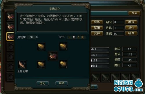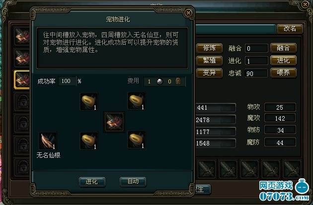 1.打开宠物面板之后,点击“进化”按钮进入宠物进化界面,界面的中间位置为需要进化的宠物,四周按提示放入宠物进化所需物品
