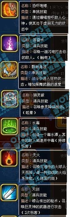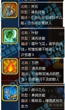 武将技能分单挑技能和清兵技能,因为技能说明里都有介绍,我就不再进行分类了。